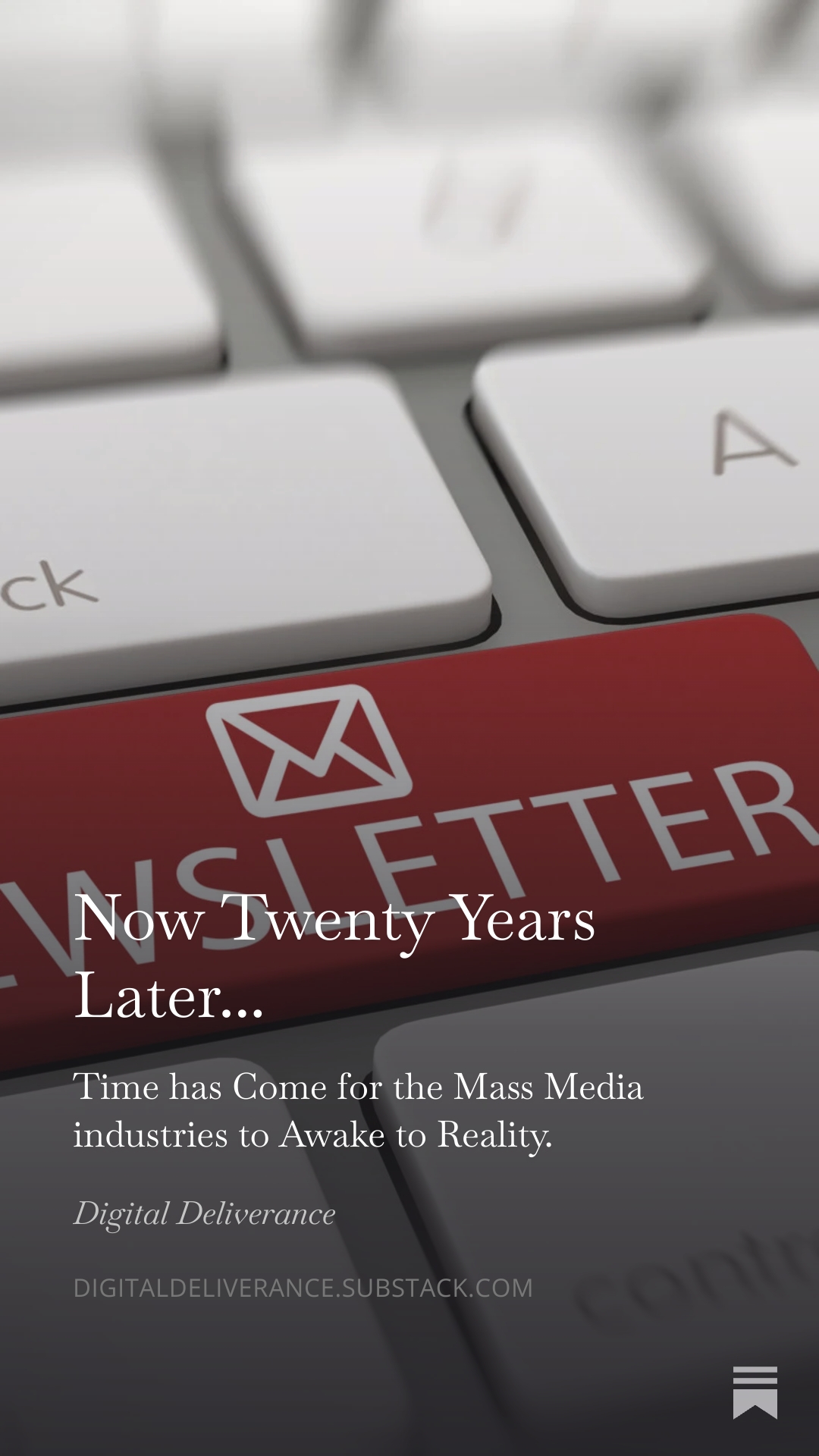 Since 1996, Digital Deliverance has been the consulting business website of Vin Crosbie, a pioneering thinker in new media whose work anticipated many of the structural changes that now define the digital age.